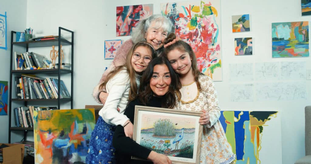 Three generations in one frame: Ilianna Rossetti holds a drawing by her mother, Joy Paschalidis, as her daughters, Xenia (left) and Anika (right), look on—Joy pictured between them above.